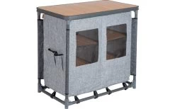 Aus eloxiertem Alu-Rundrohr, einer zentralen, rollbaren Alu-Arbeitsplatte, 2 seitlichen Ablagen aus beschichteter Hartfaserplatte und mit 2 Gewebeschränken mit Reisverschluss und inneren Ablagefächern. Mit abwischbarer Schutzfolie unter der Alu-Rollplatte. Dank der höhenverstellbaren Füße können Bodenunebenheiten problemlos ausgeglichen werden. Lieferung inklusive Windschutz und Tragetasche.