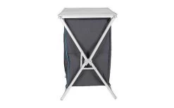 Die Ablagefächer können durch den integrierten Reißverschluss geöffnet werden, damit auch größere Gegenstände (z.B. die Gasflasche) verstaut werden können. Die Küchenbox hat eine rollbare Aluminium-Arbeitsplatte mit einer abwischbaren Folienbeschichtung unter der Arbeitsfläche.